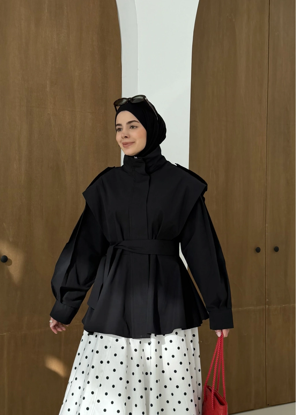 7623 Dik Yaka Geniş Omuz Trenç Siyah