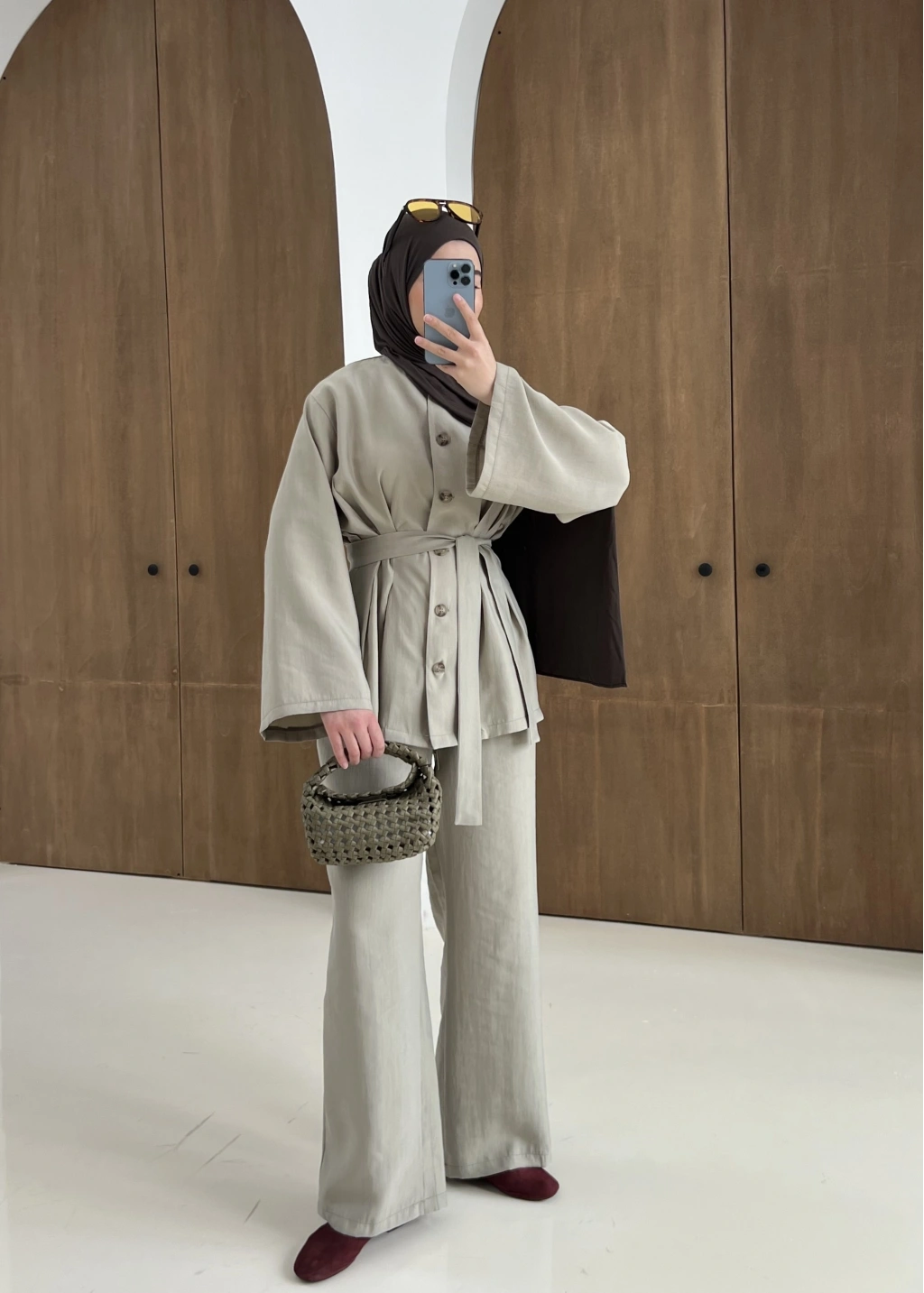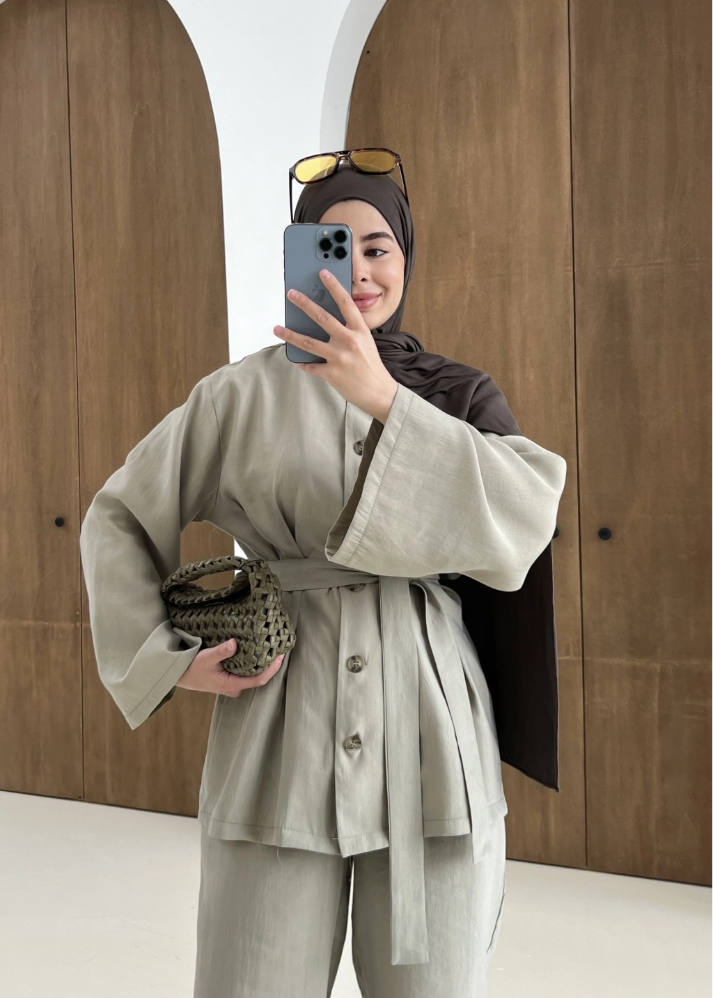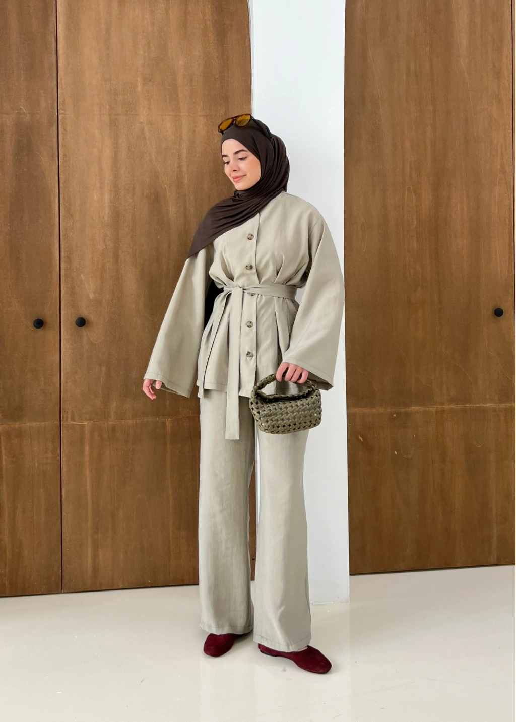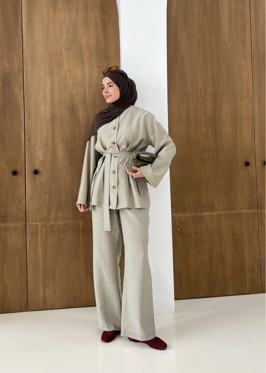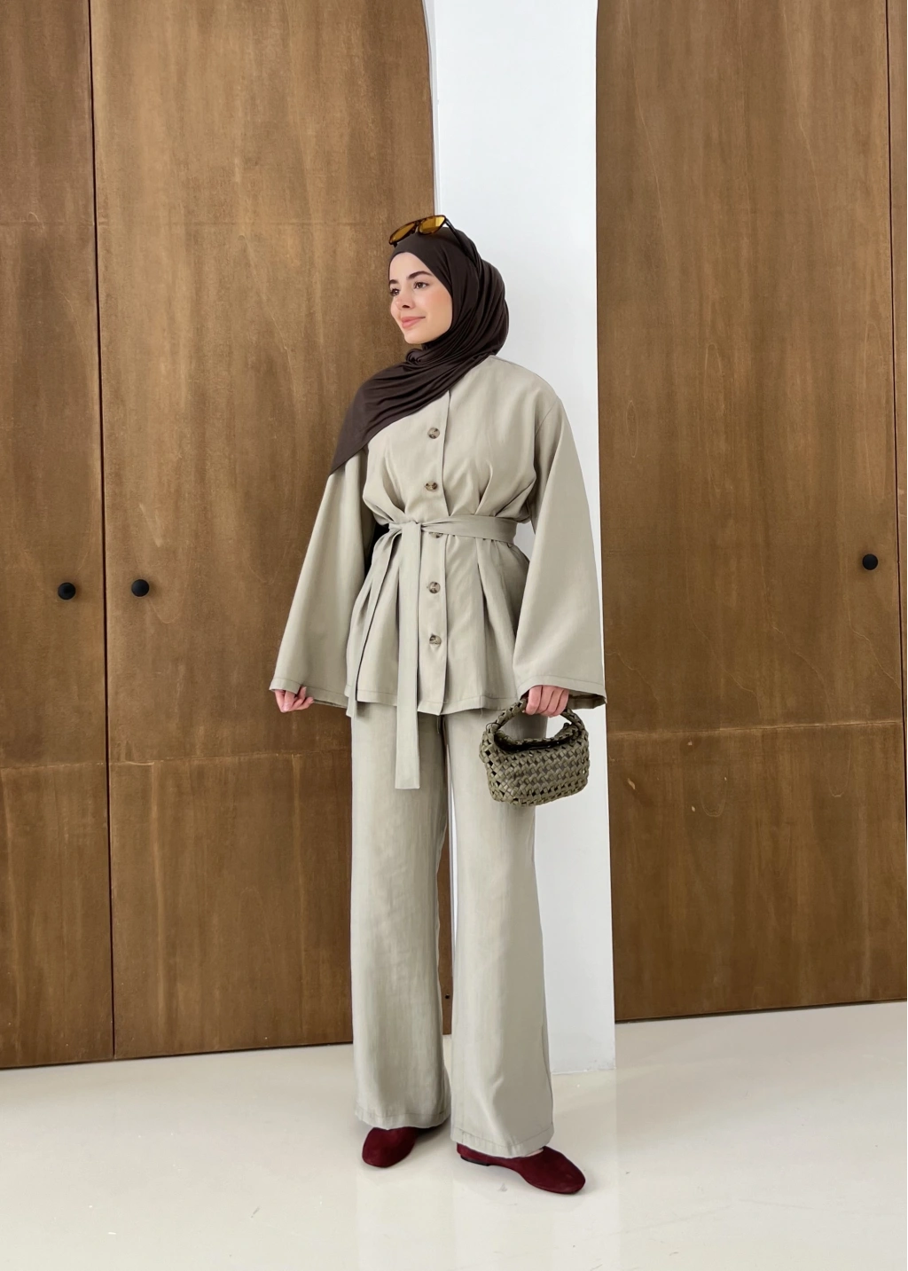 8977 MİNİK DÜĞME KETEN TAKIM kahve
