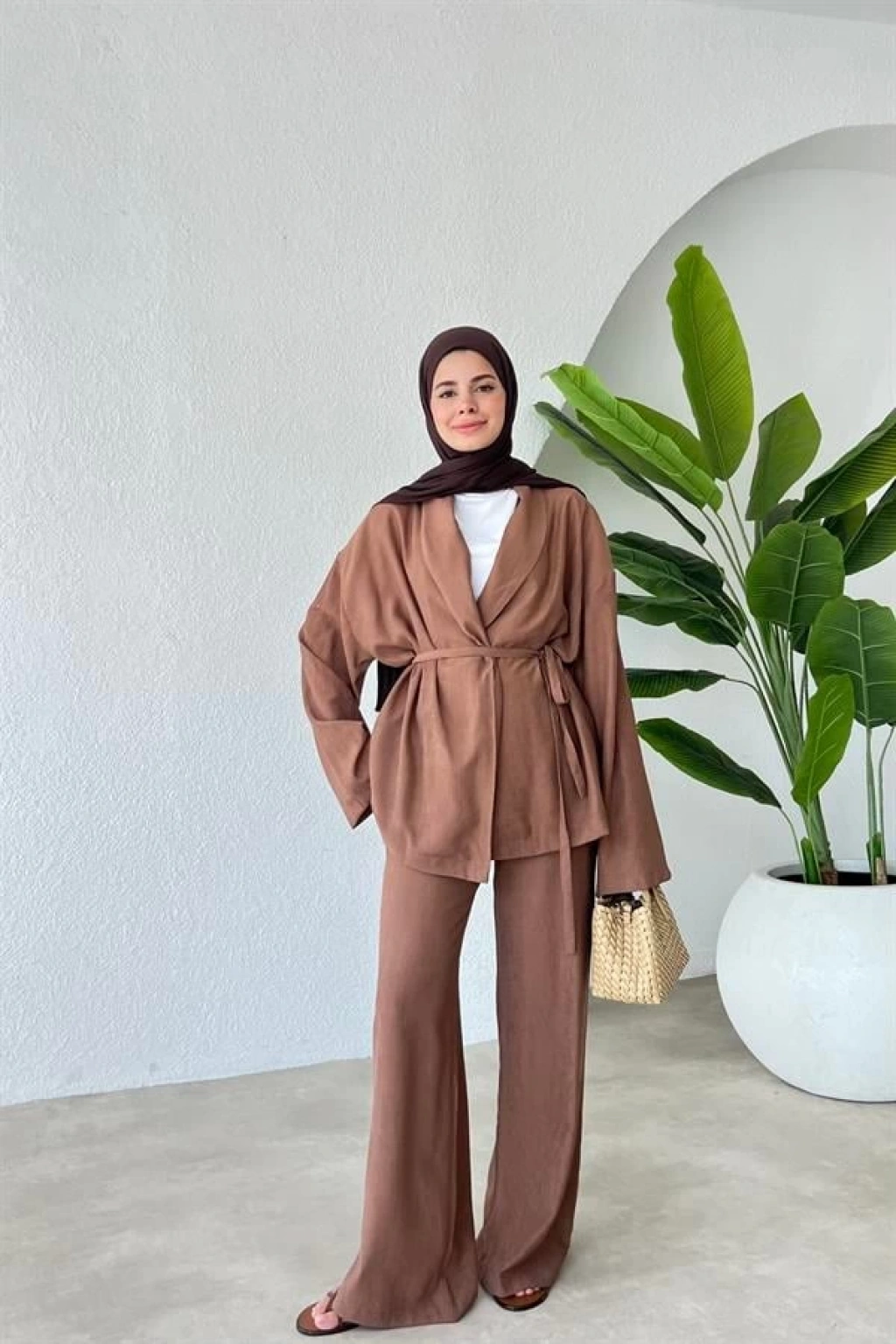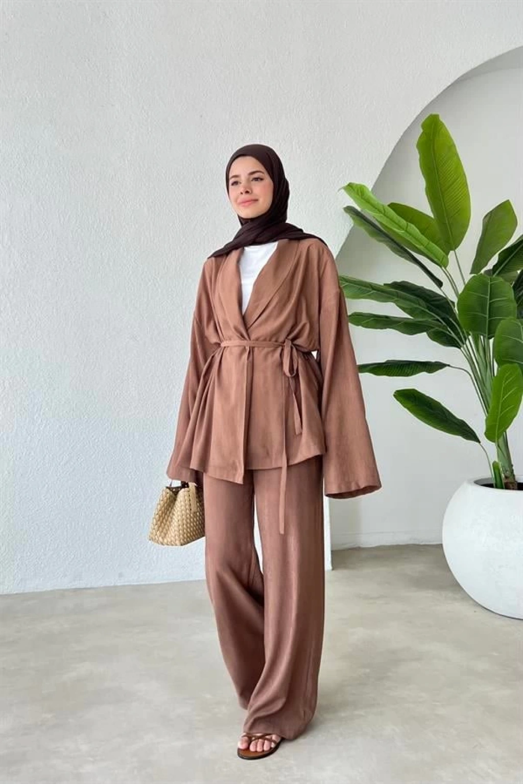 8999 ŞAL YAKA ETEKLİ KETEN TAKIM kahve