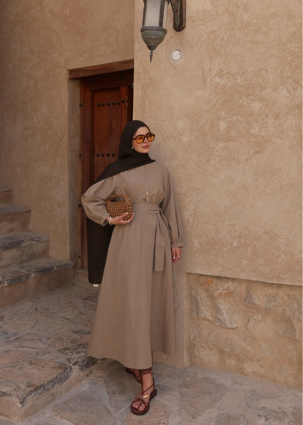 2357 Ön Düğme Ham Keten Elbise Vizon
