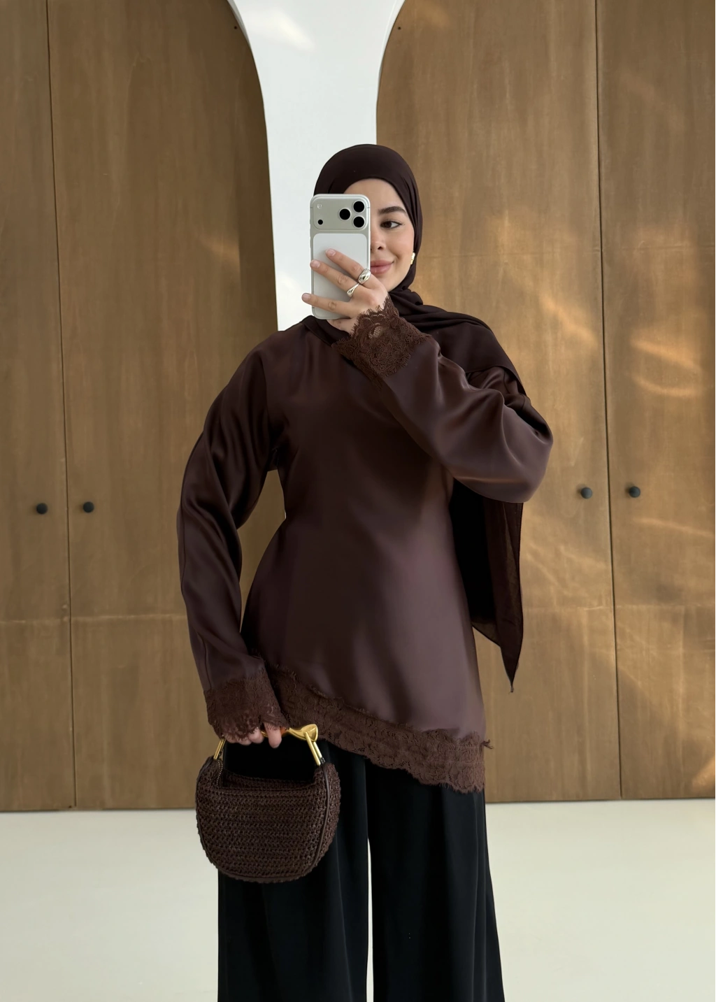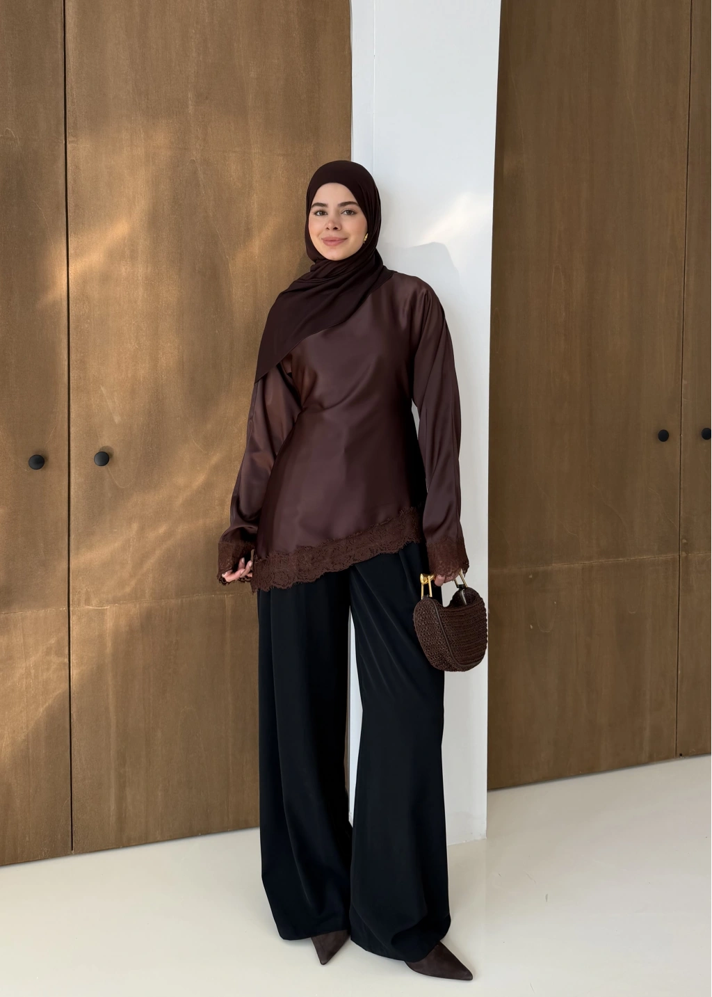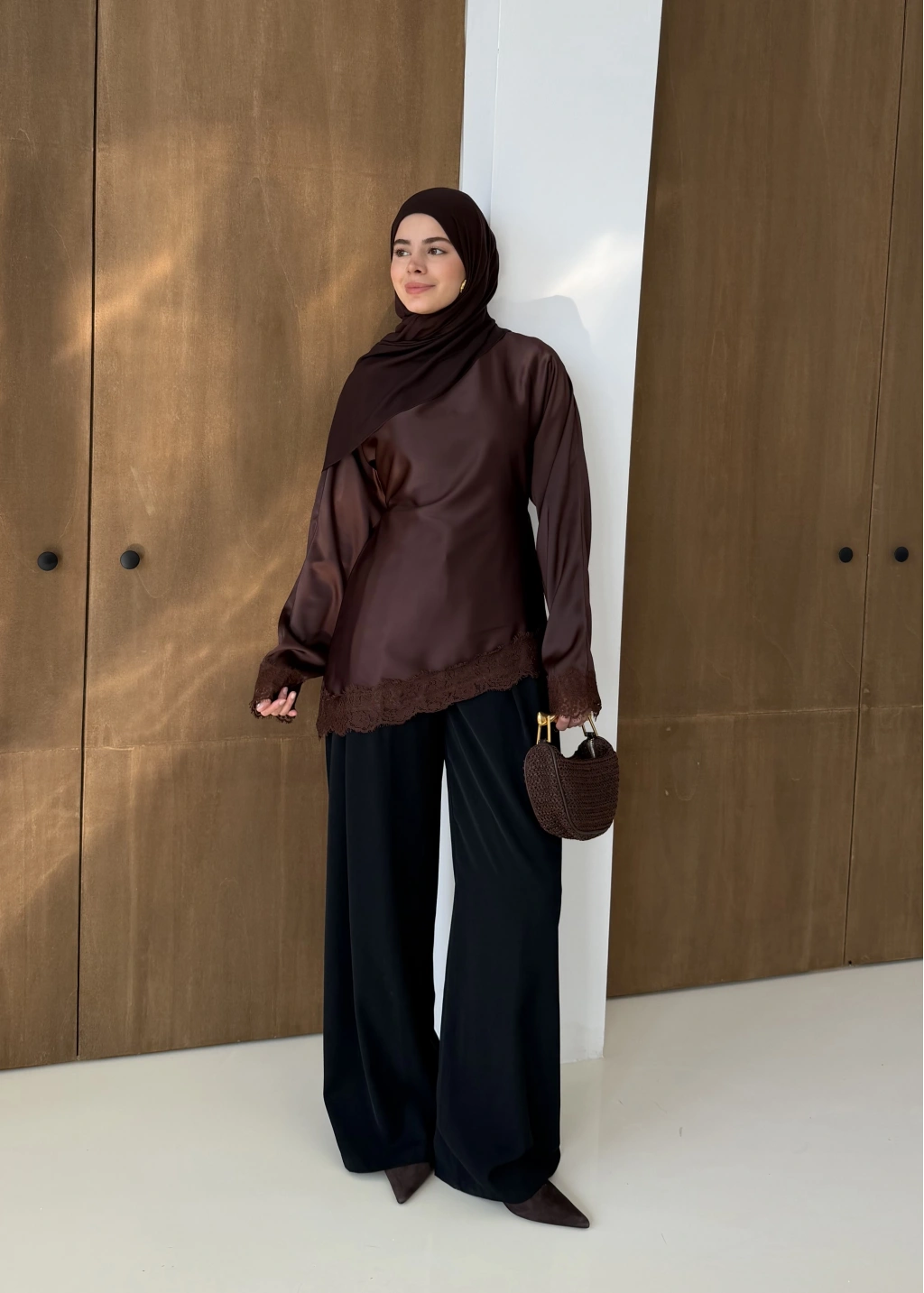 Saten Dantel Detay Üst Kahve