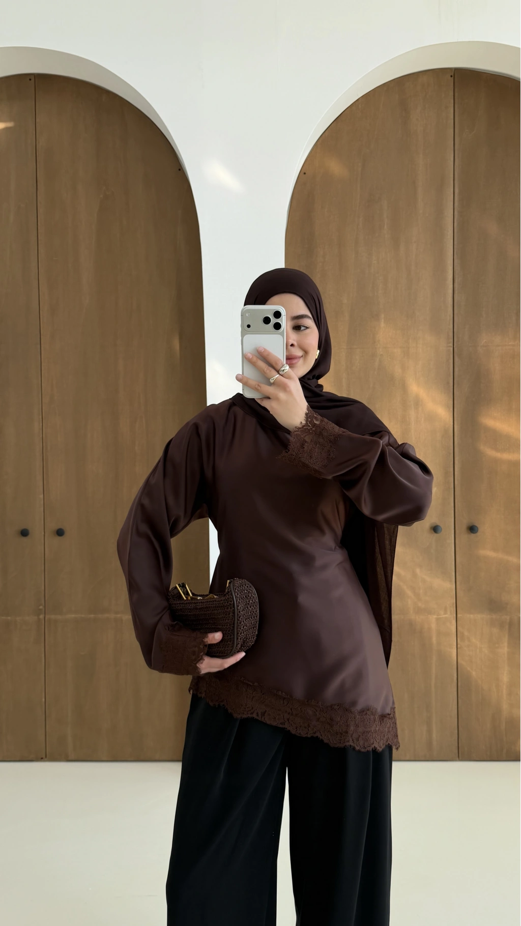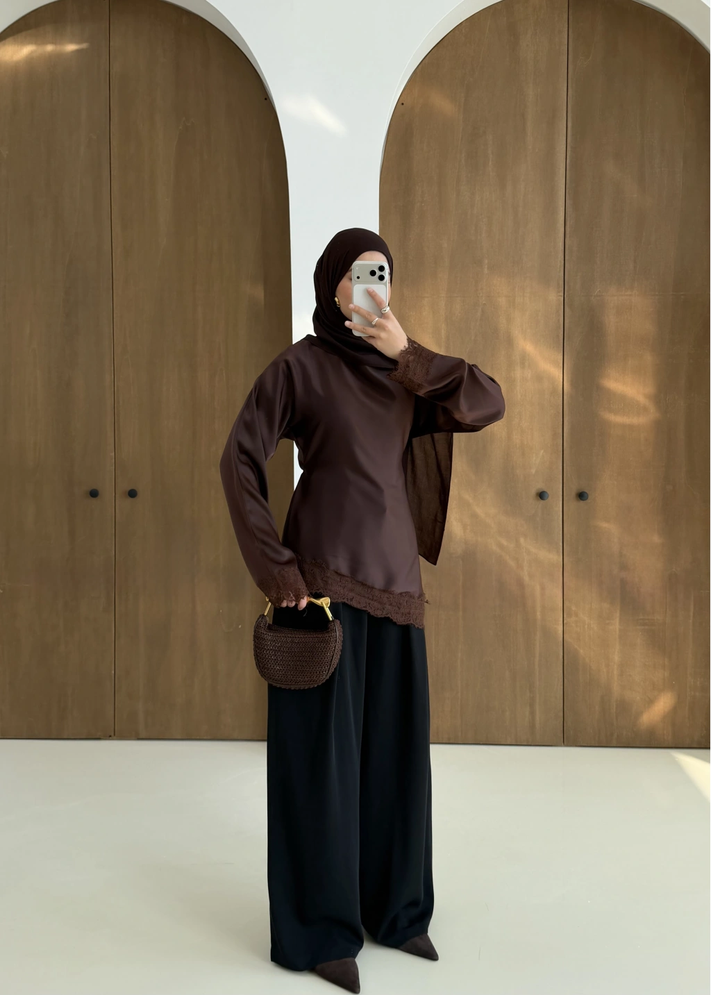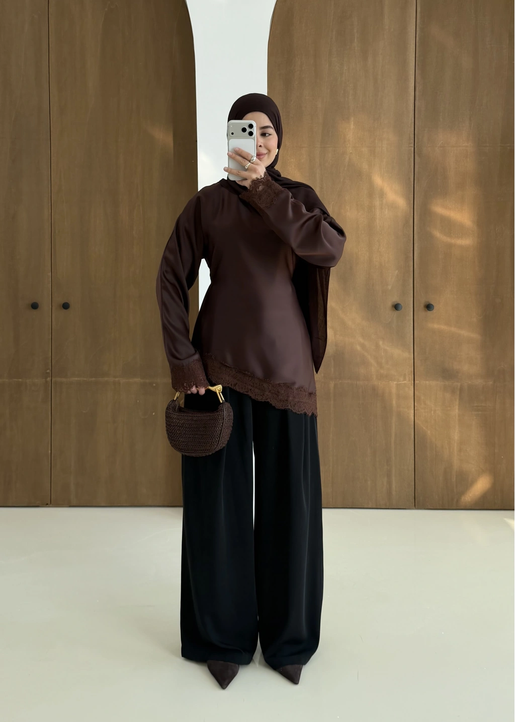 Saten Dantel Detay Üst Kahve
