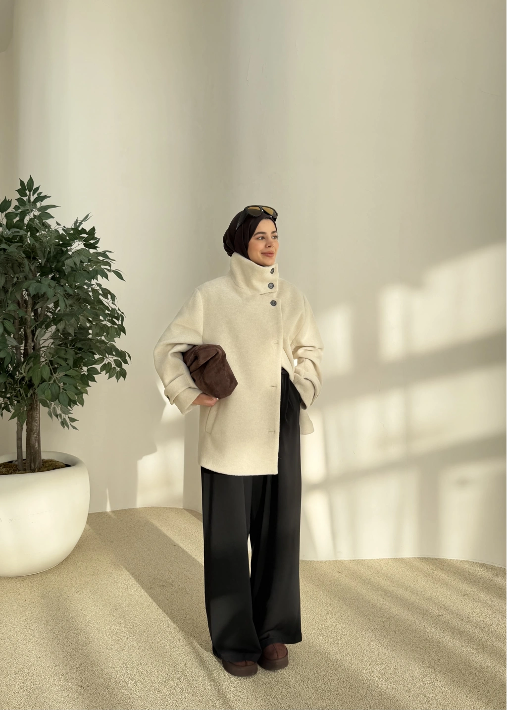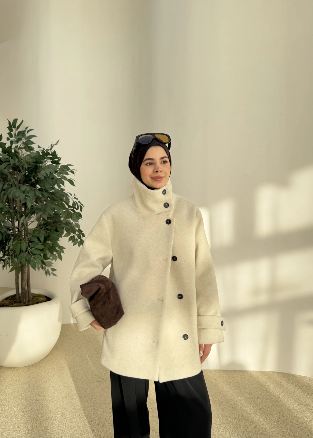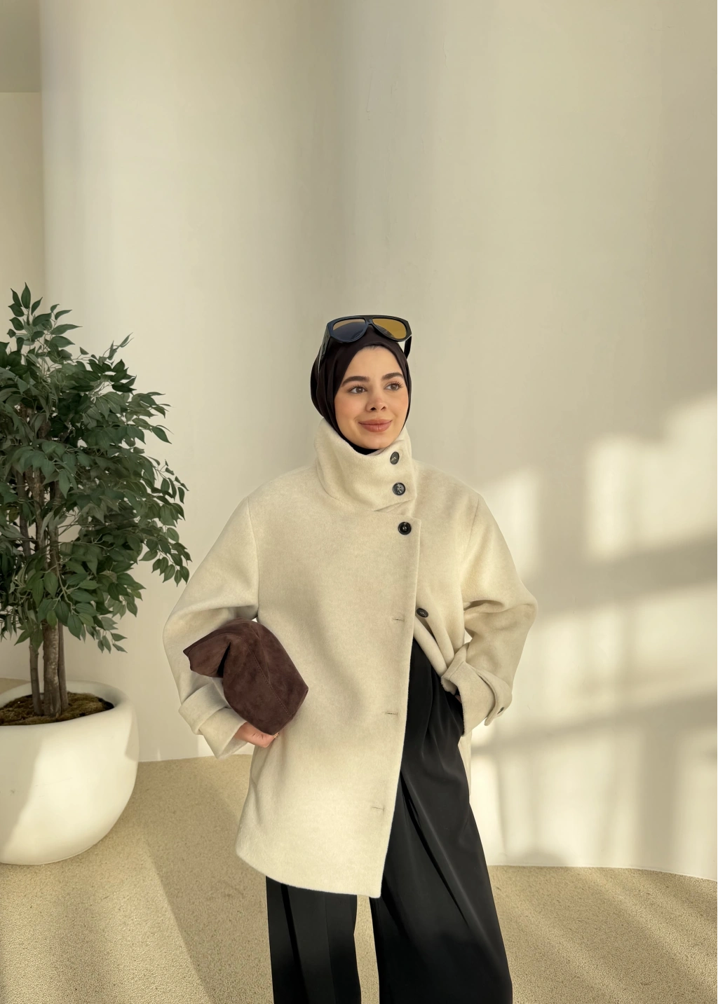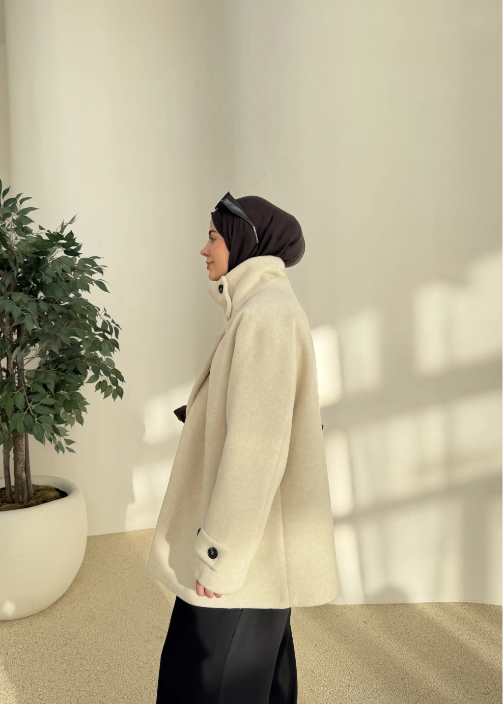 Kuşaklı Dik Yaka Kaban Bej