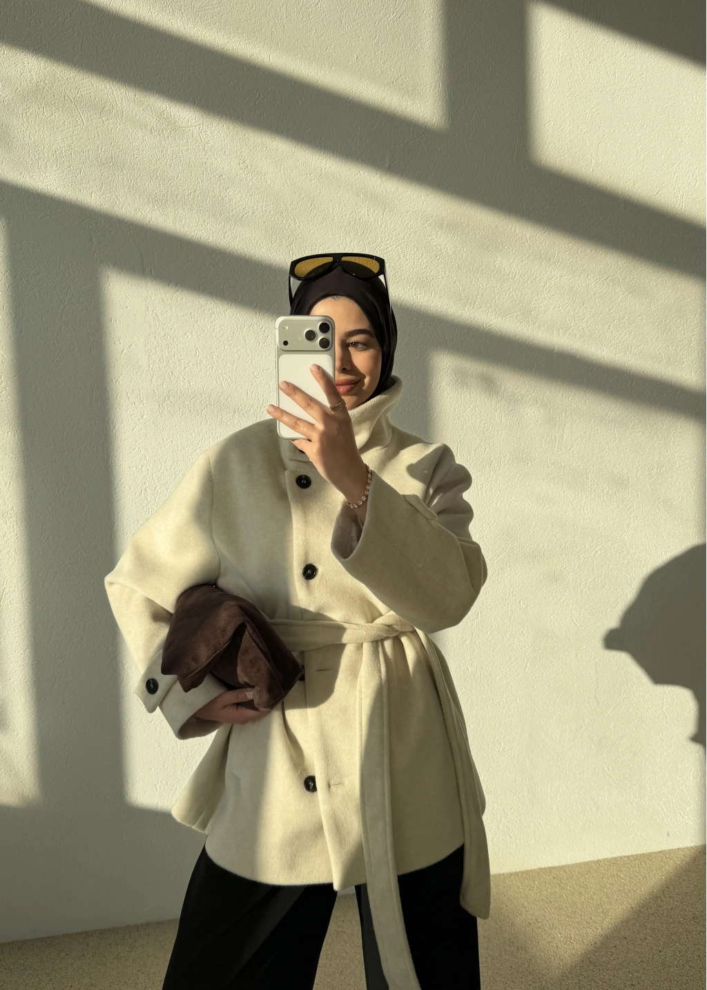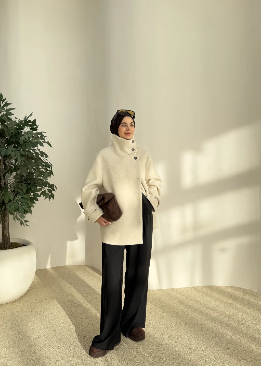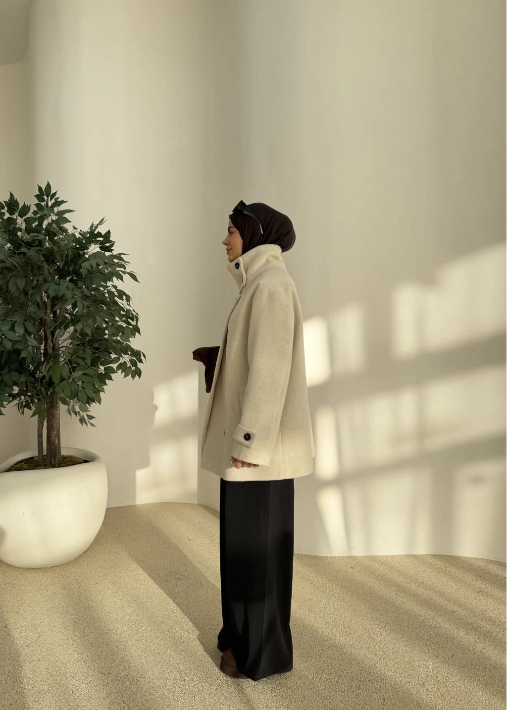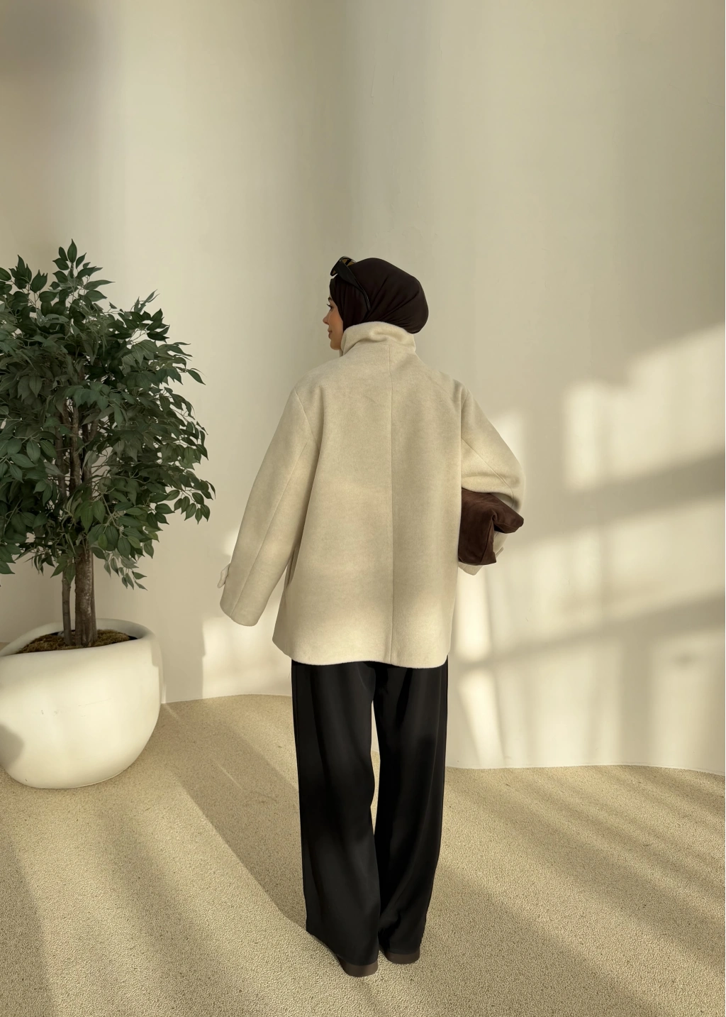 Kuşaklı Dik Yaka Kaban Bej