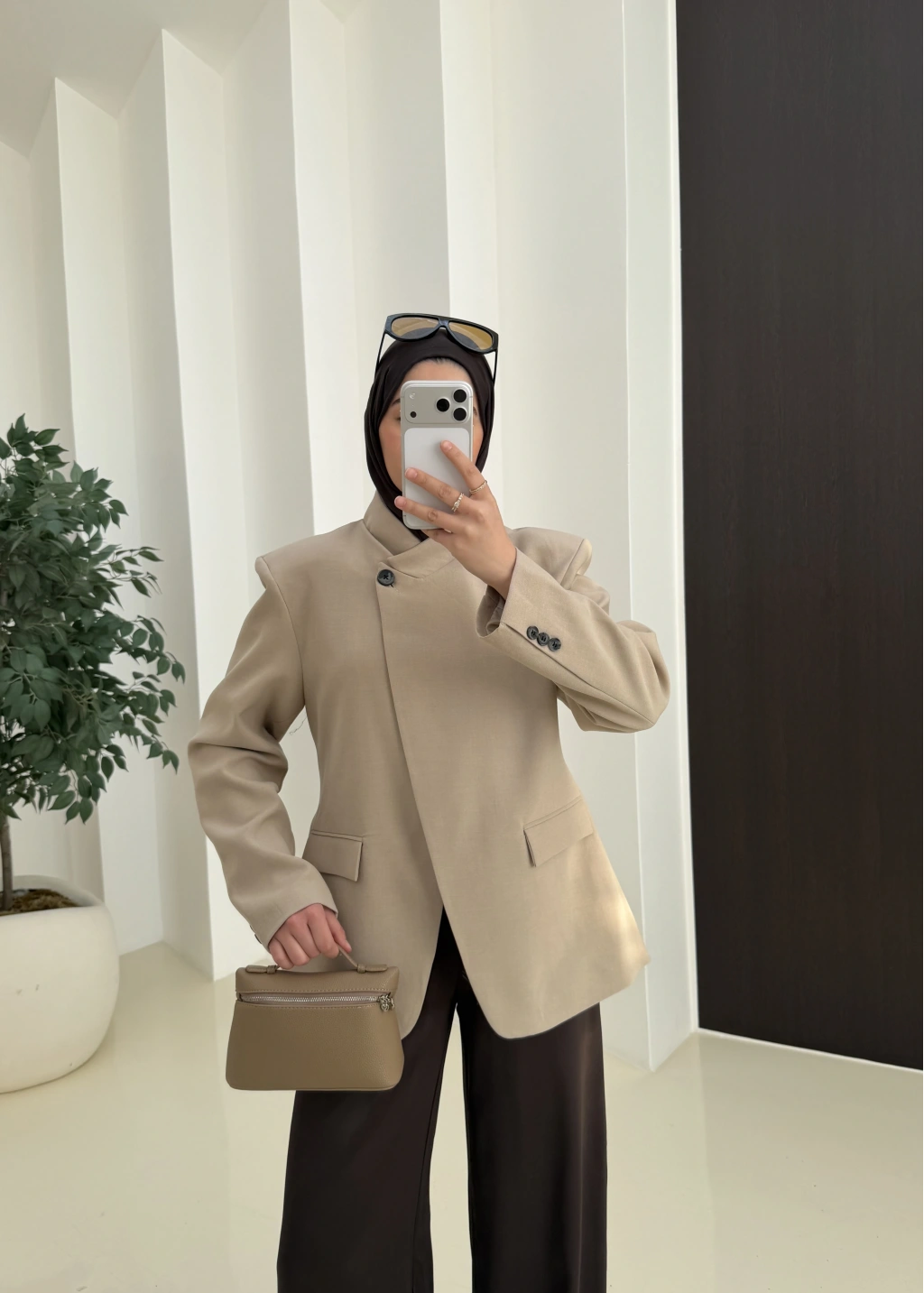 Oversize Premium Kalite Kaban Bej // Siyah Düğmeli